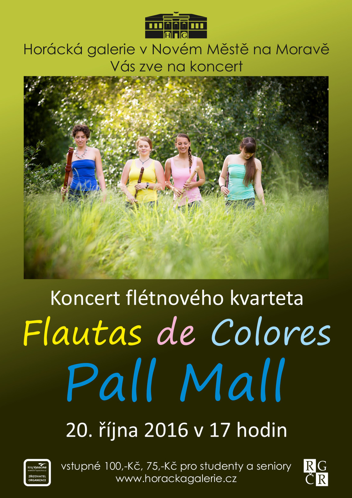 Po vernisáži se můžete těšit na koncert flétnového kvarteta Flautas de Colores v 17 hodin v podkroví HG. Čtyři půvabné dámy vám předvedou, že zobcová flétna může být nástrojem v pravdě koncertním. Tento netradiční soubor vyniká nejen technickou zdatností, ale nebojí se ani improvizace a zapojení neobvyklých prvků. V programu s názvem Pall Mall zazní originální skladby určené pro zobcové flétny z období renesance, baroka, 20. a 21. století, či řada neotřelých aranží. Vstupné bude 100Kč, pro studenty a seniory 75Kč.