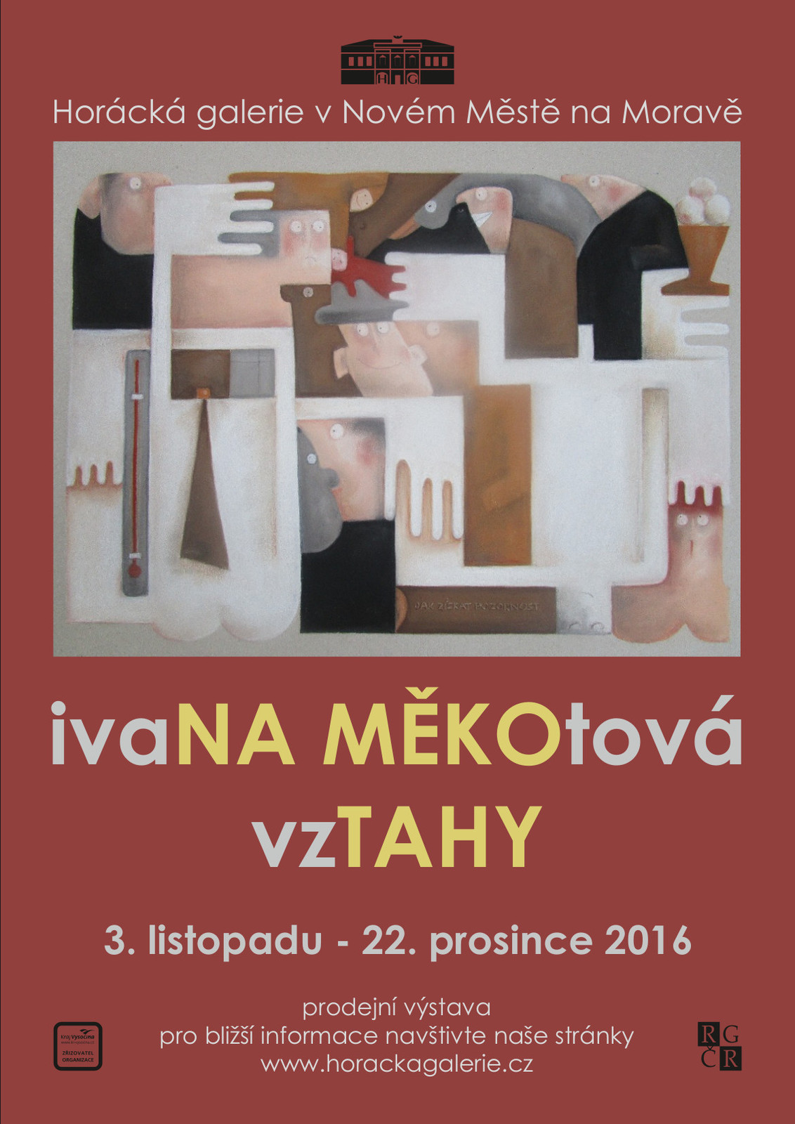 Horácká galerie vás srdečně zve na vernisáž výstavy výtvarnice ze Světlé nad Sázavou Ivany Měkotové. V Malé galerii bude k vidění několik desítek plasticky působících pastelů této umělkyně, jenž zachycují zdánlivě banální životní situace a představují je jako divadelní scénu se skrumáží na první pohled nesouvisejících postav či předmětů. Pozorovatel tak až po delším zkoumání vyčte celý příběh na obraze. Prodejní výstava s výstižným názvem vzTAHY bude zahájena 3. listopadu 2016 v 17 hodin za účasti autorky. Hudebně ji doprovodí svými improvizacemi na flétnu Aleš Bartoš.