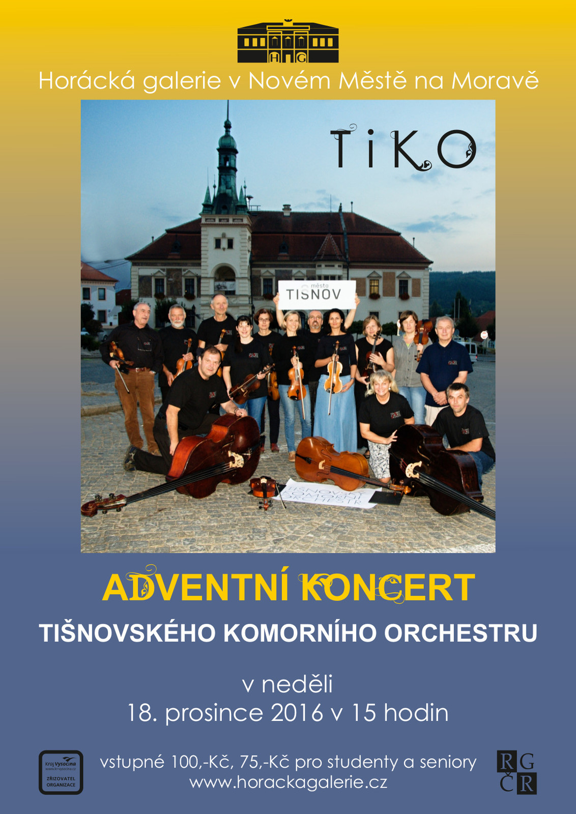 Horácká galerie vás 18. prosince 2016 zve na Adventní koncert Tišnovského komorního orchestru, jenž je neprofesionální smyčcové těleso složené z hudebníků z Tišnova, Brna a okolí. V jeho řadách jsou však také zastoupeni hudební profesionálové jako stálí hráči nebo hosté. Orchestr vystoupil na mnoha místech ČR, na Slovensku, v Polsku či Rakousku a zúčastnil se celé řady festivalů, či přehlídek. Vystupuje s renomovanými herci, s vynikajícími sólisty, spolupracuje s pěveckými sbory. V současné době stojí v čele souboru Jarosla Kolesa. Diváci nedělního koncertu se mohou těšit nejen na skladby W. A. Mozarta, či J. S. Bacha, ale uslyší i pásmo koled E. Zámečníka, které všechny dostanou do správné vánoční nálady. Na vystoupení, které začíná v 15 hodin zahrají i solisté Hana Hrachovinová na harfu a klavírista Filip Synek. Vstupné 100 Kč, pro studenty a seniory 75 Kč.