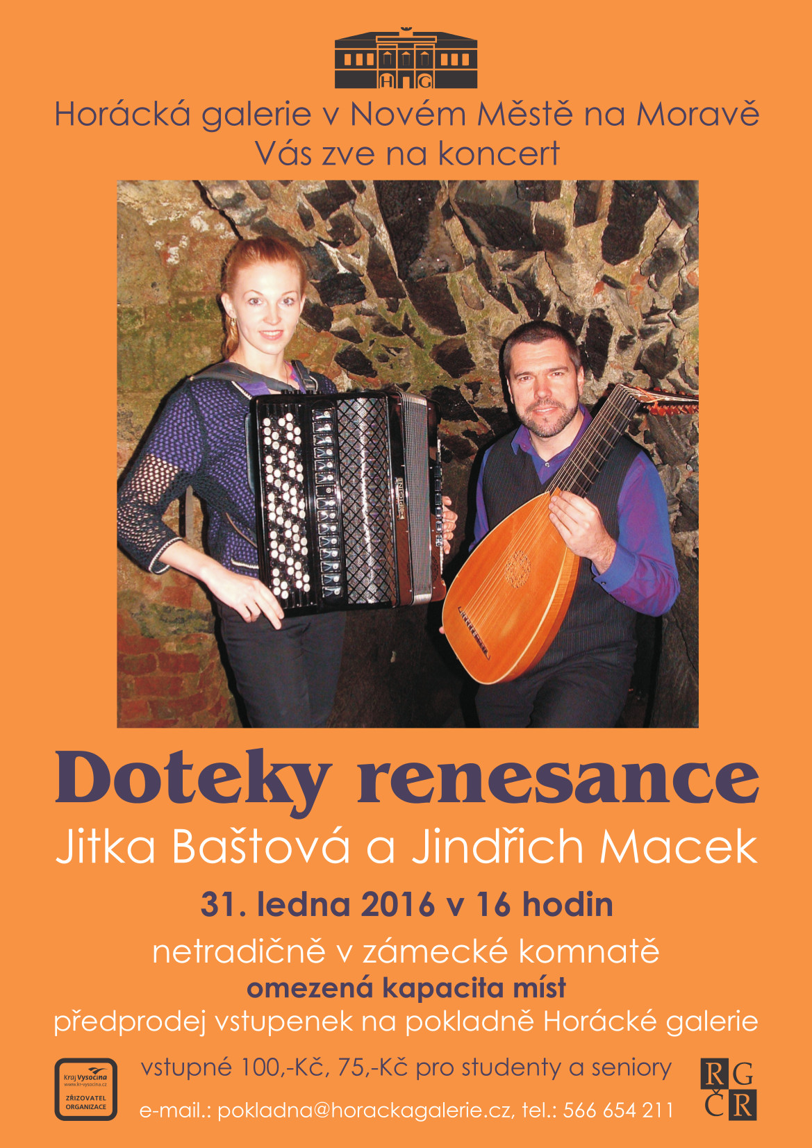 Rádi bychom také upozornili, že vzhledem k výjimečnosti akce je počet míst na koncert omezen. Rezervace vstupenek je možná na pokladně Horácké galerie.