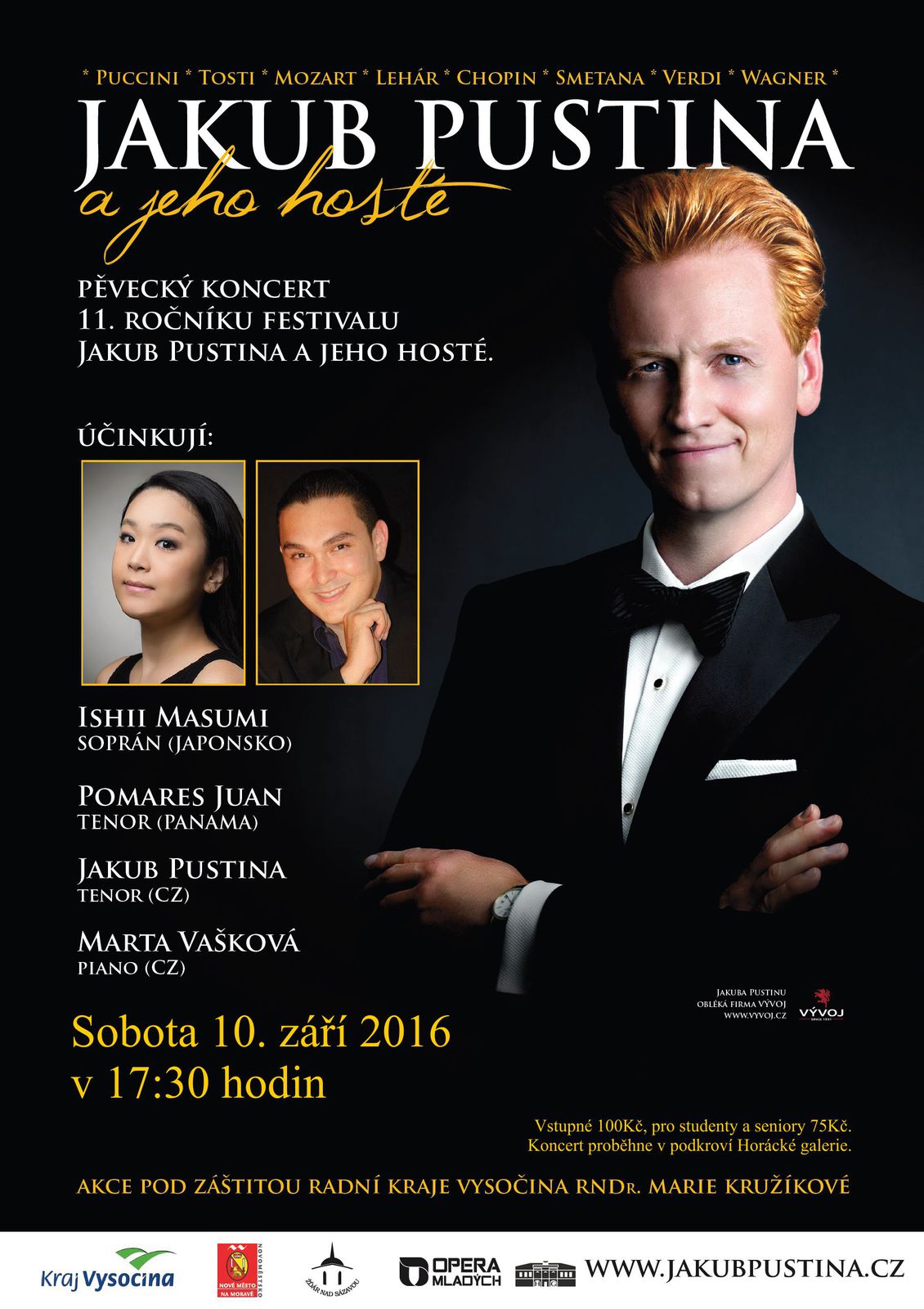 Ti z vás, kteří by dychtili po dalších kulturních zážitcích, mohou navštívit vystoupení operních pěvců v zámeckém podkroví. Projekt s názvem Jakub Pustina a jeho hosté, tento rok již jedenáctý ročník, přiveze opět kromě krásné hudby i výborné zpěváky ze zahraničí. Tentokrát k nám zavítá sopranistka z Japonska Ishii Masumi a panamský tenorista Juan Pomares. Na klavír je doprovodí doc. Marta Vašková a chybět samozřejmě nebude ani Jakub Pustina. Těšit se můžete na díla vrcholných autorů operní tvorby i na tradiční písně ze zemí našich letošních hostů. Vystoupení proběhne v 17:30, vstupenky (100Kč, pro studenti a senioři 75Kč) budou k zakoupení v pokladně.