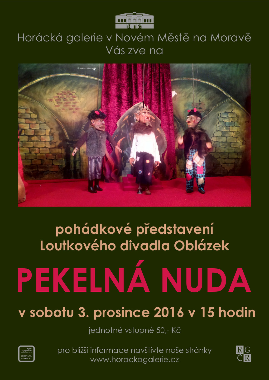 Blíží se tradiční Mikulášská nadílka a sní spojený rej čertů a čertic. Horácká galerie si při této příležitosti připravila pro děti dvě zajímavé akce.Myslíte, že je v pekle nuda? Dozvíte se to v sobotu 3. prosince 2016 v 15 hodin v podkroví Horácké galerie. Pohádku plnou čertů i kouzel s názvem Pekelná nuda, v níž nebude chybět ani chytrý Kašpárek, přiveze loutkové divadlo Oblázek Krucemburk. Představení je hráno tradičními marionetami v originálních kulisách, z nichž některé jsou až sto let staré. Také samotné loutky pamatují vaše pradědečky a prababičky. Po hře se s nimi budete moci seznámit osobně. Akce je vhodná nejen pro děti, ale pro všechny diváky od 3 do 99 let, jenž loutkové divadlo milují. Vstupné je 50,- Kč pro děti i dospělé.