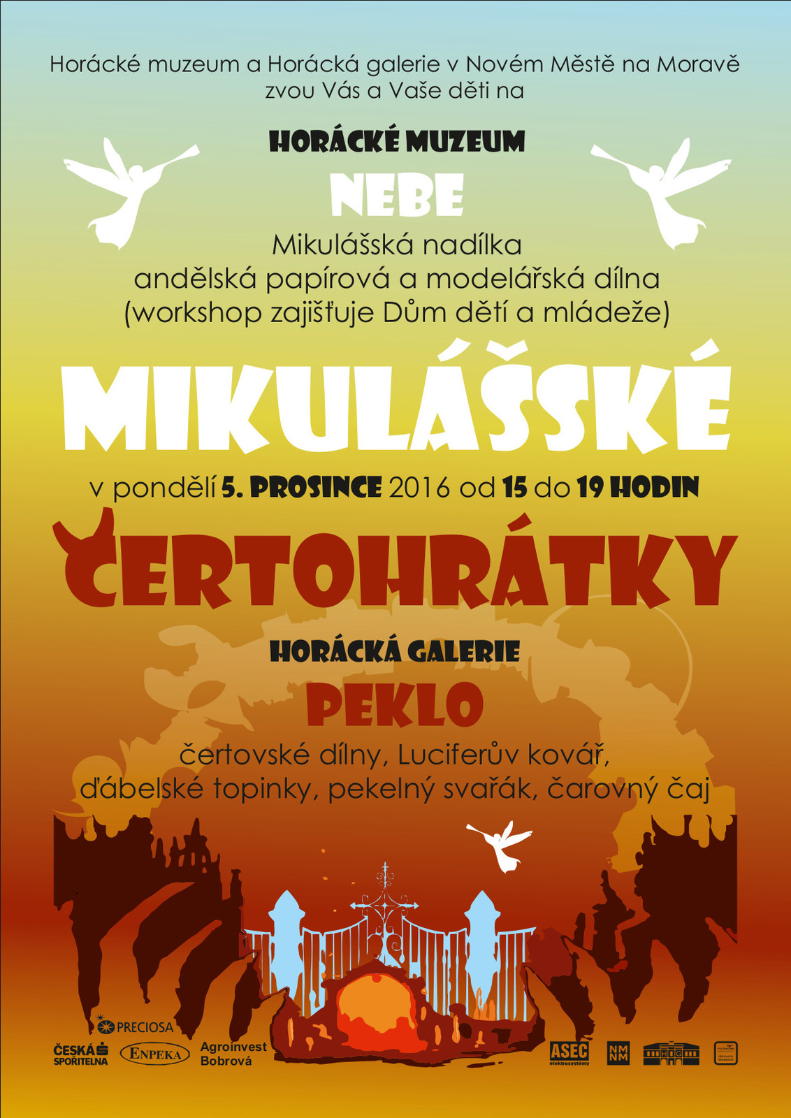 V pondělí 5. prosince 2016 se můžete těšit na Mikulášské čertohrátky, které pořádá Horácká galerie ve spolupráci s Horáckým muzeem a DDM. Galerijní sklepy a zákoutí opět po roce osídlí páchnoucí, nevrlí čerti, kteří čekají na malé i velké hříšníky. Nádvoří obsadí Lucifer se svou kovadlinou, zlí raraši se nastěhují do sklepa. Letošní novinkou bude Luciferna, kde budou hrát naši čerti karty, nebo kostky. Snad si tedy nebudou všímat zlobivců. Samozřejmostí bude také něco dobrého na zub pro děti, či dospělé. Kreativní povahy potěší tvořivá dílna. Akce bude probíhat paralelně v Horácké galerii a v Horáckém muzeu od 15 do 19 hodin.
