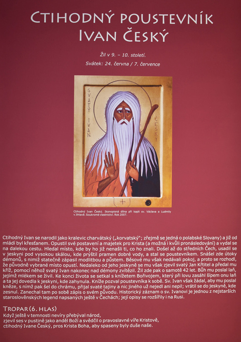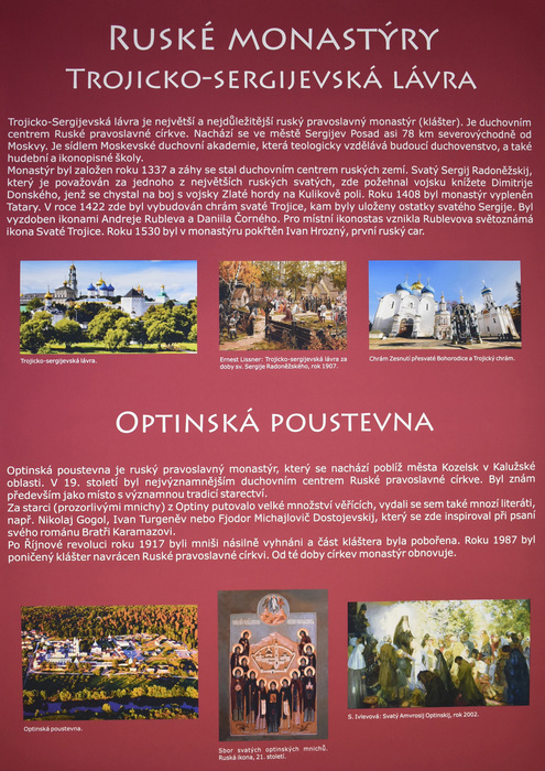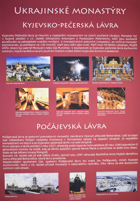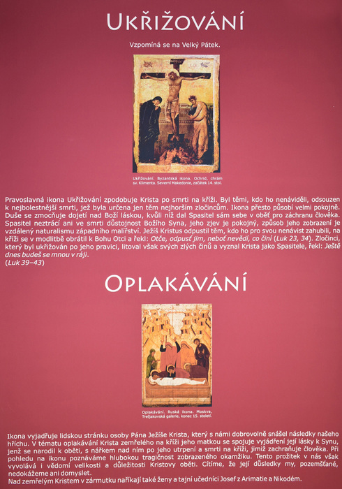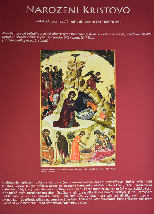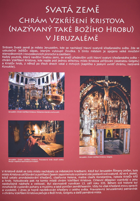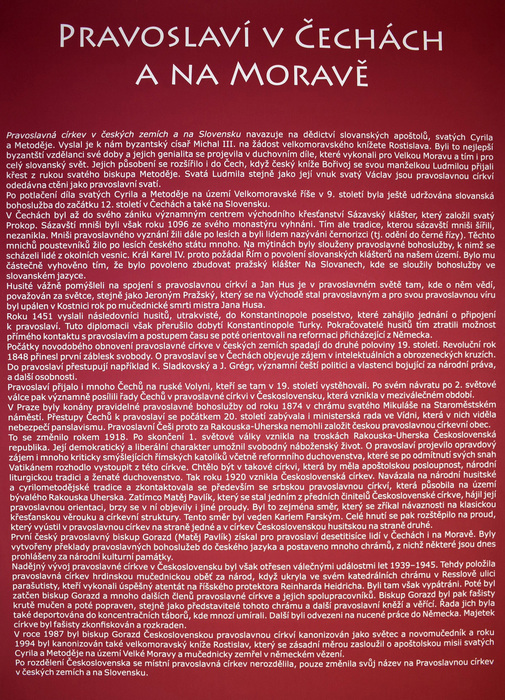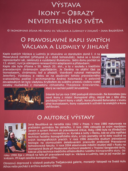 Výstava provází zájemce tajemným světem ikon a pravoslavných chrámů. Kromě nejdůležitějších náboženských motivů znázorňovaných na ikonách budou představena také nejvýznamnější pravoslavná poutní místa i čeští světci. Autorka ikon Jana Baudišová se učila malířské technice řeckého ikonografického stylu v monastýru sv. Kyriaka a Julity v Řecku a absolvovala stáž psaní ikon v Trojicko-sergijevské lávře v Rusku.