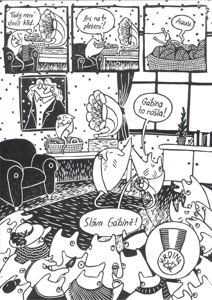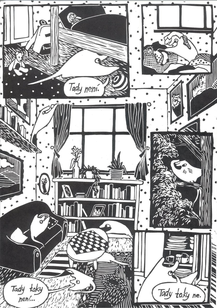Komiks zhotovený technikou linorytu představuje velmi zdařilé dílo, které vyniká nejen svou technickou precizností, ale i uchopením krátkého příběhu. Autorka zvolila motiv ztraceného a následně nalezeného člena rodiny v rozlehlém domě. Výrazná grafická stylizace, typická pro linoryt, je zde využita s velkým citem – kontrast mezi černou a bílou plochou podtrhuje atmosféru příběhu a zároveň umožňuje jasnou čitelnost jednotlivých scén. Kompozice jednotlivých panelů je promyšlená, rytmus vyprávění plynulý a dobře strukturovaný. Postavy a prostředí je jednotné a působí autenticky. Celkově se jedná o velmi kvalitní autorský počin, který spojuje výtvarnou zručnost s citlivým vyprávěním.