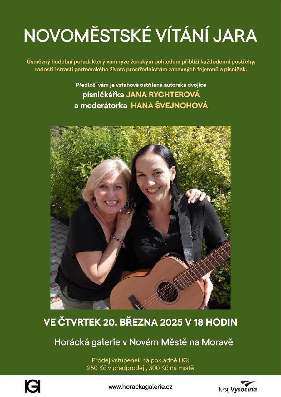 Originální písničkářka s kytarou Jana Rychterová zavítá podruhé do Horácké galerie, tentokrát ve společnosti moderátorky s pisatelskou vášní Hany Švejnohové. Obě dámy spojuje spontánnost i smysl pro humor, a tak společně připravily úsměvně laděný hudební pořad, v něm ryze ženským pohledem přibližují každodenní postřehy, radosti i strasti partnerského života prostřednictvím zábavných fejetonů, písniček a improvizace, jenž je dílem okamžiku. Jak samy říkají: „S dámami v publiku počítáme, pánové jsou vítáni!“