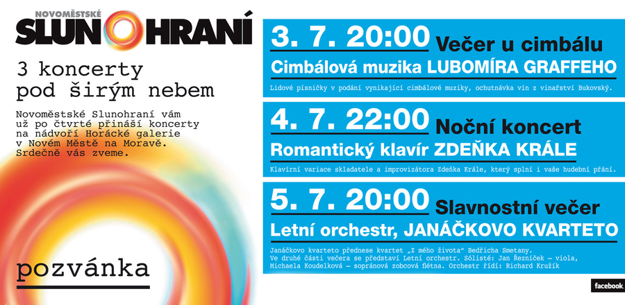 Letošní Slunohraní se může pochlubit nejen parádní atmosférou, ale i výraznými umělci, kteří program podpořili. Slunohraní přilákalo do Horácké galerie Cimbálovou muziku pod taktovkou Lubomíra Graffeho, klavírního virtuosa Zdeňka Krále, dirigenta Richarda Kružíka, umělkyni Michaelu Koudelkovou i Janáčkovo kvarteto.