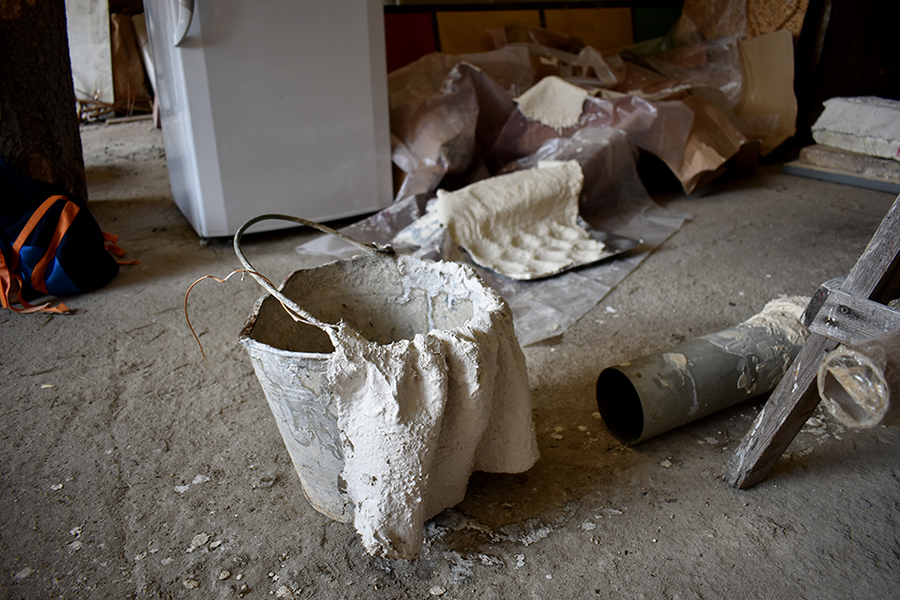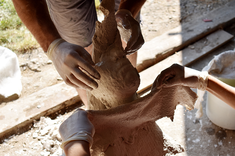 Inspirací pro další dílnu bylo dílo sochaře Jana Hendrycha, na které intuitivně navazuje tvorba našeho hosta Aleše Nováka. Umělec a lektor Aleš Novák se s námi podělil o svoji osobitou metodu tvorby soch skrze tvarování geotextilie namočené do sádry či betonu. Určitě se mu podařilo přenést svoji energii a nadšení na oba odvážné účastníky dílny. Ocenili jsme rozličné předměty a tvary, které nabízel prostor staré stodoly v areálu galerie. Během odpoledního plenéru vznikly čtyři sochy, z nichž dvě se už vyjímají v domácím prostředí Honzy a Petra.