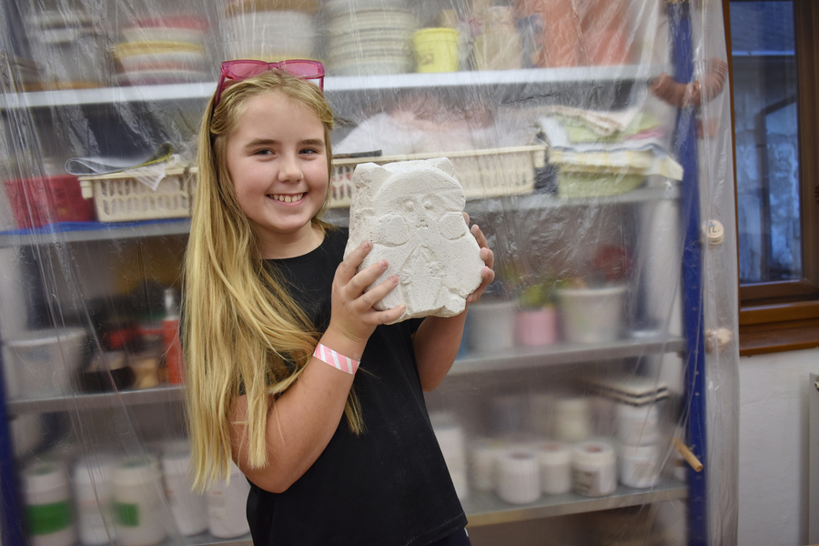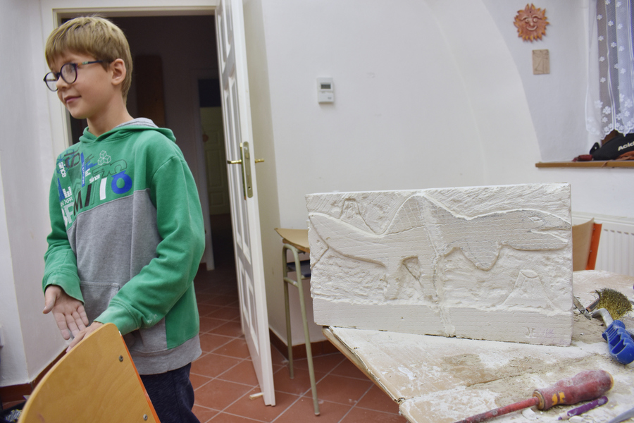 V listopadovou neděli odpoledne proběhl v naší dílně řemeslně založený workshop se sochařem a designérem Štěpánem Jílkem, který pochází z nedaleké Borovnice. Na pomoc si umělec, žijící aktuálně spíše v Praze, přizval i svoji přítelkyni sochařku Josefínu Jonášovou. Po krátkém představení všech se děti dozvěděly o pár zajímavých příkladech ze světa současného sochařství a mohly se jimi inspirovat. Každý si pak vymyslel vlastní motiv sochy a vytvořil její jednoduchý nákres na kus kartonu. Následně ho přenesl na ytongový kvádr. Menší děti dělaly reliéfně pojaté plastiky, starší si už mohli dovolit udělat opravdu trojrozměrnou sochu. Ytong je sice poměrně měkký materiál, ale i tak dá zabrat, než z něj nějakou sochu vytesáte. Používali jsme pilky, dláta a kladiva, rašple, rydla, šroubováky. Vznikla socha křečka, minecraftového psa Žolíka, hlemýždě, reliéf dinosaura a kočičky. Děti byly nadšené, že za pár hodin vytvořily vlastníma rukama hmatatelnou a poměrně velkou sochu svého oblíbence.